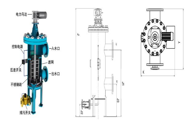 循環水旁濾器多個濾筒安裝于一個過濾器筒體內,結構緊湊。全自動反沖洗過濾器用于去除低粘度介質中的固體顆粒。需過濾的介質從內向外流過過濾器的楔形網濾芯,固體顆粒截留在濾芯內側。隨著污染物的增多,過濾器污染側和清潔側之間的壓差增大。若壓差達到設置的觸發壓差便開始自動反沖洗。反沖洗時.電動機通過減速器轉動欲清洗濾芯下面的沖洗臂,進入反沖洗狀態的濾芯,原料液流被中斷。反沖洗排污閥門(電磁閥/氣動閥)開啟,濾液側和反沖洗管路之間的壓降把一小部分濾液逆向沖入欲清洗的濾芯。聚積在濾筒內側的污染顆粒物被松開并通過沖洗臂沖進反沖洗管路。濾芯的反沖洗時間一過,反沖洗閥立即關閉。